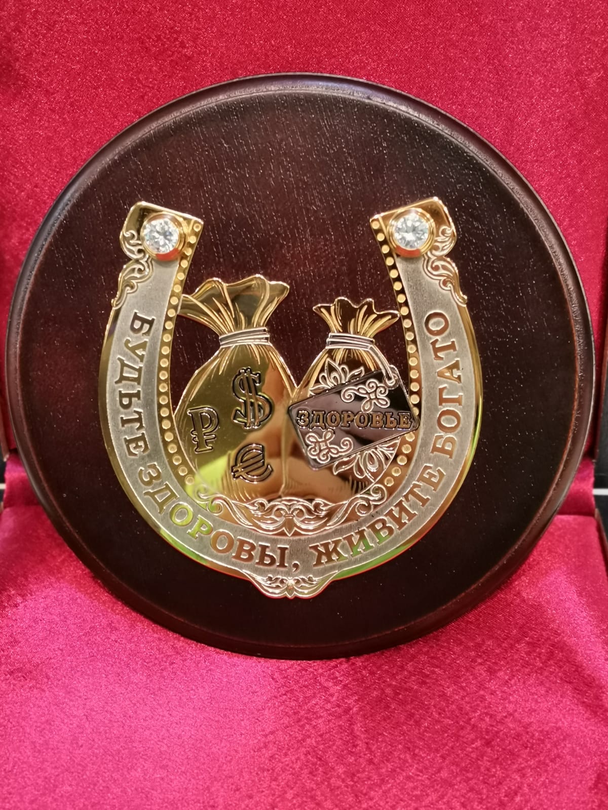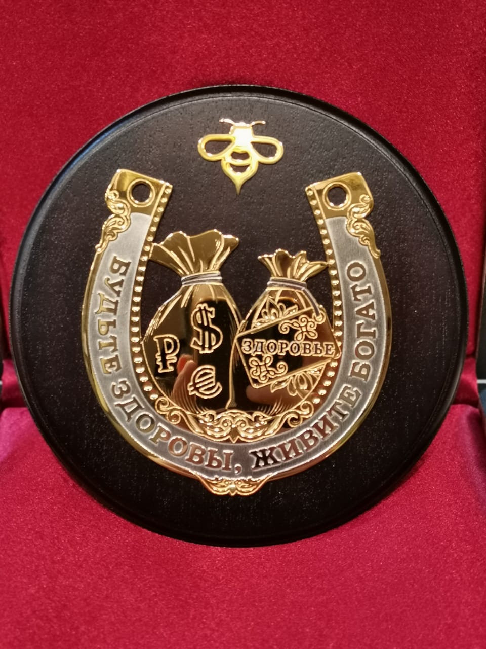 Композиция выложена на древесной пластине. Подкова с надписью создана из сплава металлов и украшена вручную в соответствии со старинными методами златоустовской гравюры на металле.