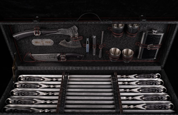 шампур ОГОНЕК - 10 шт, топор ЕРМАК (40х13) - 1 шт, нож КУХНЯ широкий - 1 шт, стопки - 4шт, фляга - 1 шт, мультитул - 1 шт, шпажки -5 шт, нож складной - 1шт